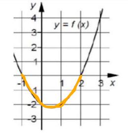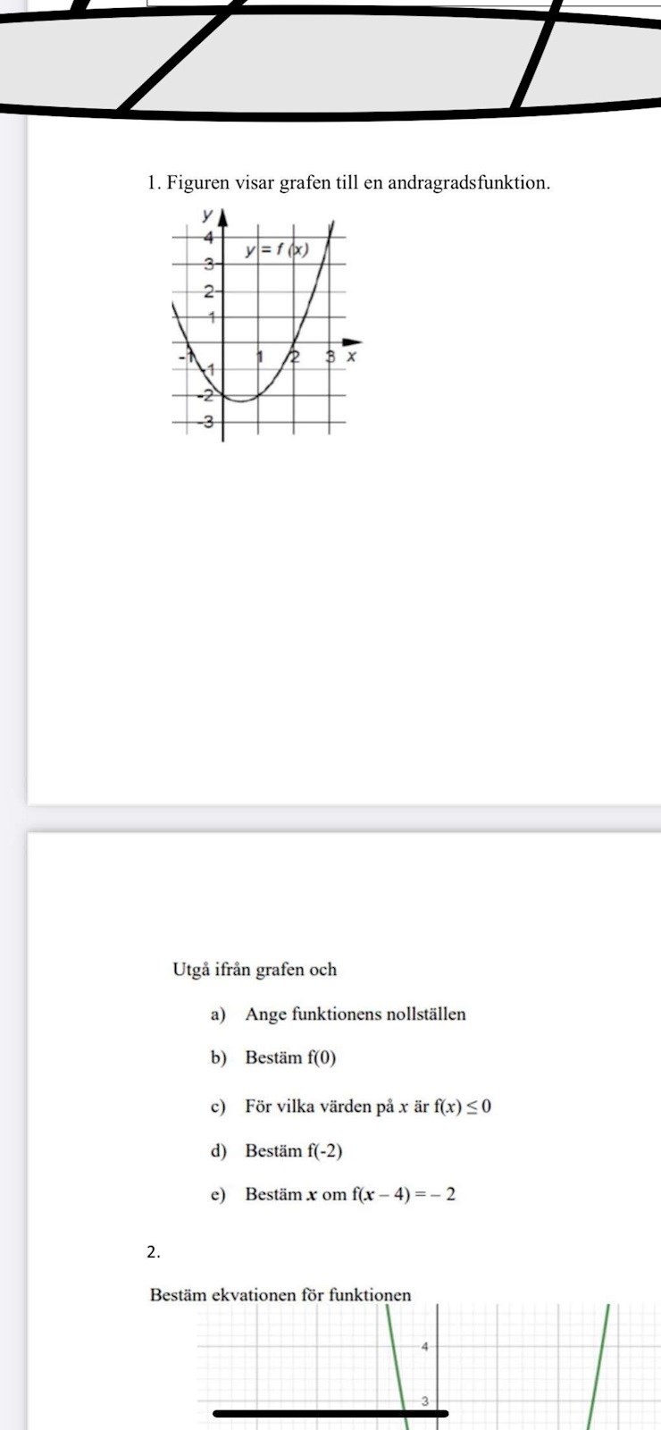 I c) gäller det att se när f(x), alltså y-värdet, 0. Se gula linjen nedan. Vilka värden på x ger ett negativt y-värde (eller 0)?