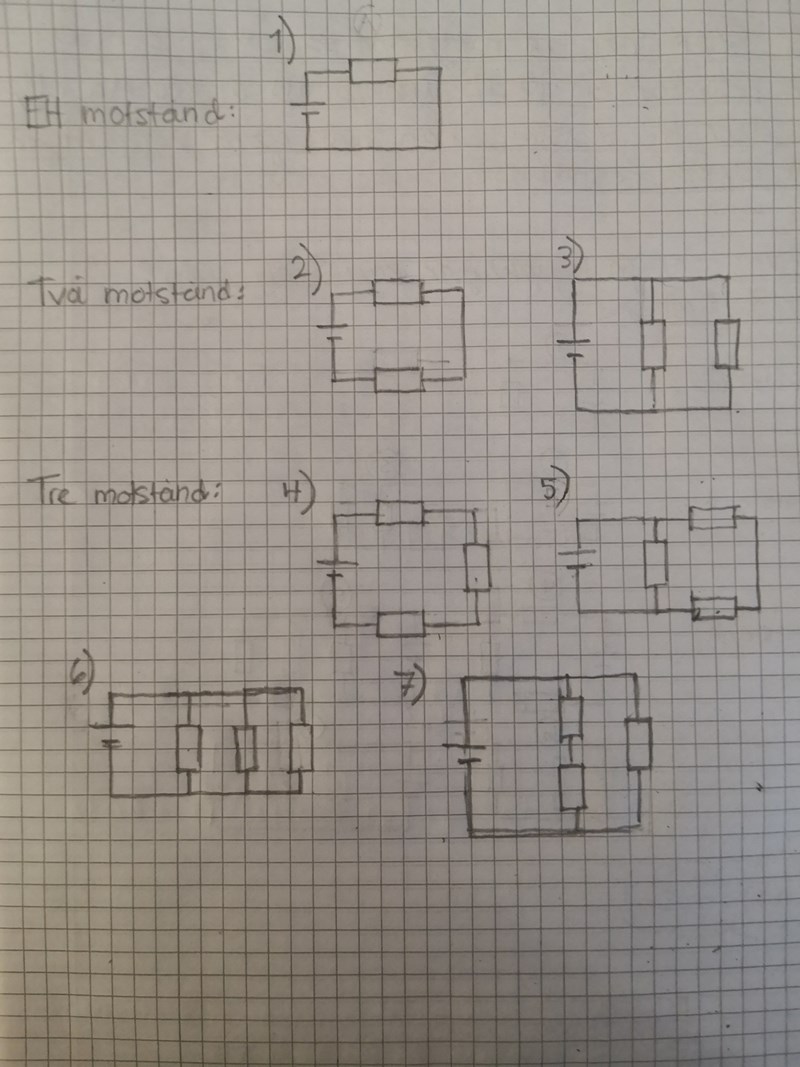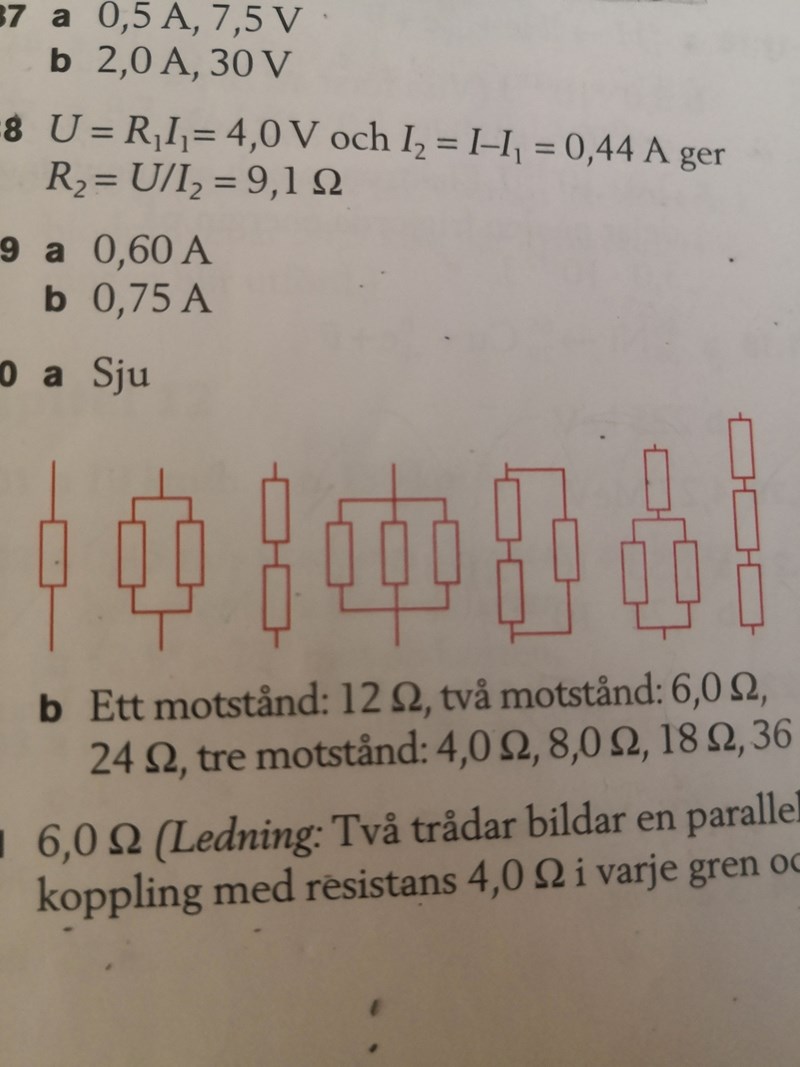 "Sven har tre motstånd som vart och ett har resistans en 12 ohm. Genom att använda ett, två eller tre motstånd kan han göra kopplingar med olika resistans. A) Hur många olika kopplingar kan Sven göra? Rita figurer."