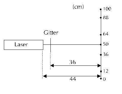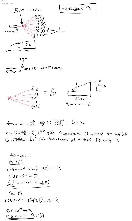 Ljuset från en laser passerar ett gitter med 570 streck/mm. På en meterstav uppkommer ljusfläcka enligt figuren Gör en beräkning av laserljusets våglängd?.jpg?width=800&upscale=false)