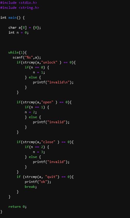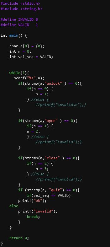 och detta ska jag då göra på de 3 olika if funktion då och i else lägga till printf("invalid"); men jag måste också sätta in en printf("ok"); någonstans?