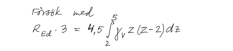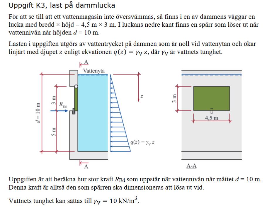 Jag har tänkt moment kring gångjärnet på luckan och får då: Red*3-10*10*8 =0 vilket ger Red= 266.6kN svaret ska vara 270 kN. Men jag har inte fått in arean så tror det är fel :/