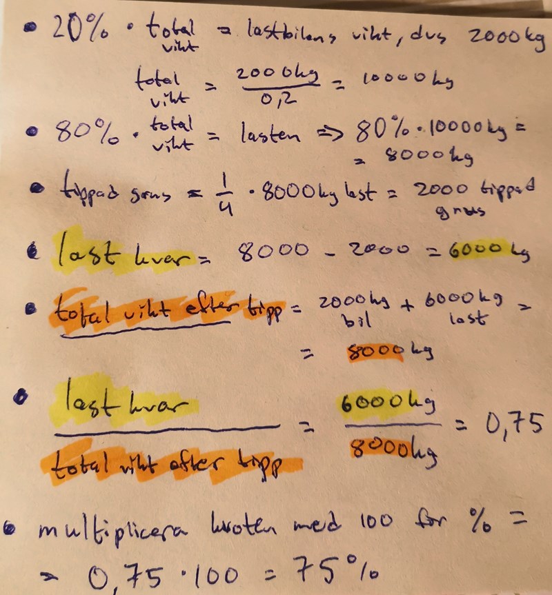 Mårtens lastbil väger 2000 kg utan last. När han hade hämtat första lasset med grus så var lasten 80 % av bilens totala vikt.På byggplatsen på Eriksdalskolans fotbollsplan tippade han av en fjärdedel av gruset.Hur stor del av bilens totala vikt utgjorde den last som var kvar?