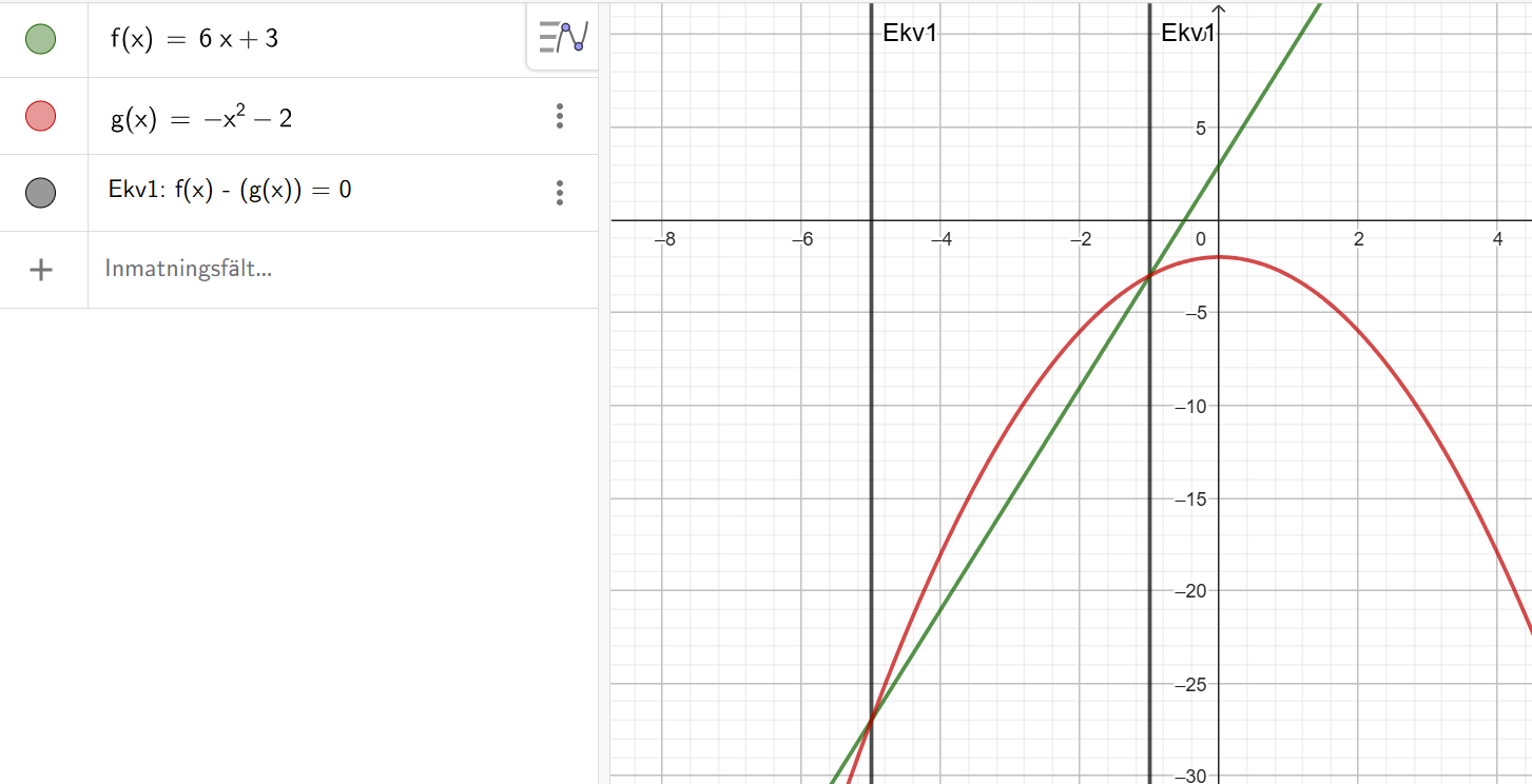 låt f(x)=6x+3 och g(x)=-x^2-2. Vad är f(x)=g(x)?