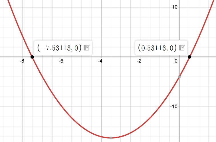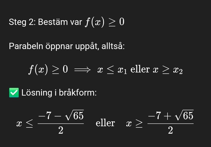 så ser du att grafens kurva ligger ovanför -axeln (d.v.s. -värdet är positivt) för punkter där ligger till vänster om -7.53 (vilket motsvarar ) och sedan för punkter där ligger till höger om 0.53 (detta motsvarar )