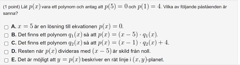 Låt p(x) vara ett polynom och antag att p(5) = 0 och p(1)=4. Vilka av följande påståenden är sanna?