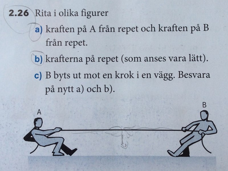 Smaragdalena skrev:Just det - du behöver inte bry dig om att egentligen verkar kraften mg (riktad neråt) på repet också. Eftersom vi betraktar repet som lätt, sätter vi g = 0, och då blir ju även mg = 0.