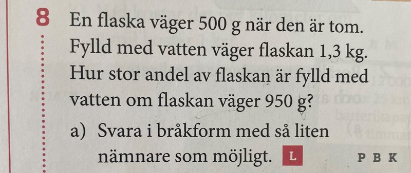 Räkna sen ut vikten av vattnet när flaskan väger 950g.