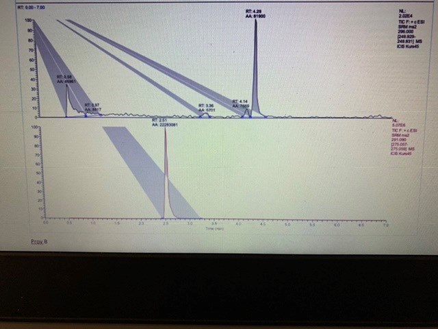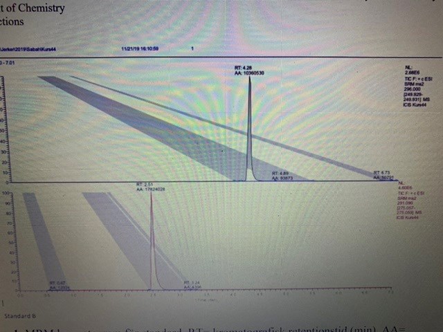 Jag har i en labb använt LC-MS/MS för att beräkna halten ibuprofen i en tablett. Jag har fått två MRM kromatogram där den ena är på ibuprofen och den andra är på en standard lösning.