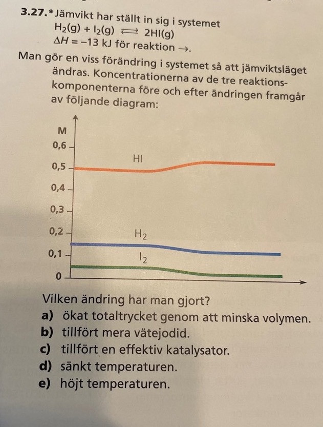 Jag har förstått att svaret är d eftersom reaktionen är exoterm och reaktionen förskjutits åt höger, men jag har svårt för resonemanget och hur jag ska visualisera reaktionen, eller är det bara en regel man får lära sig?