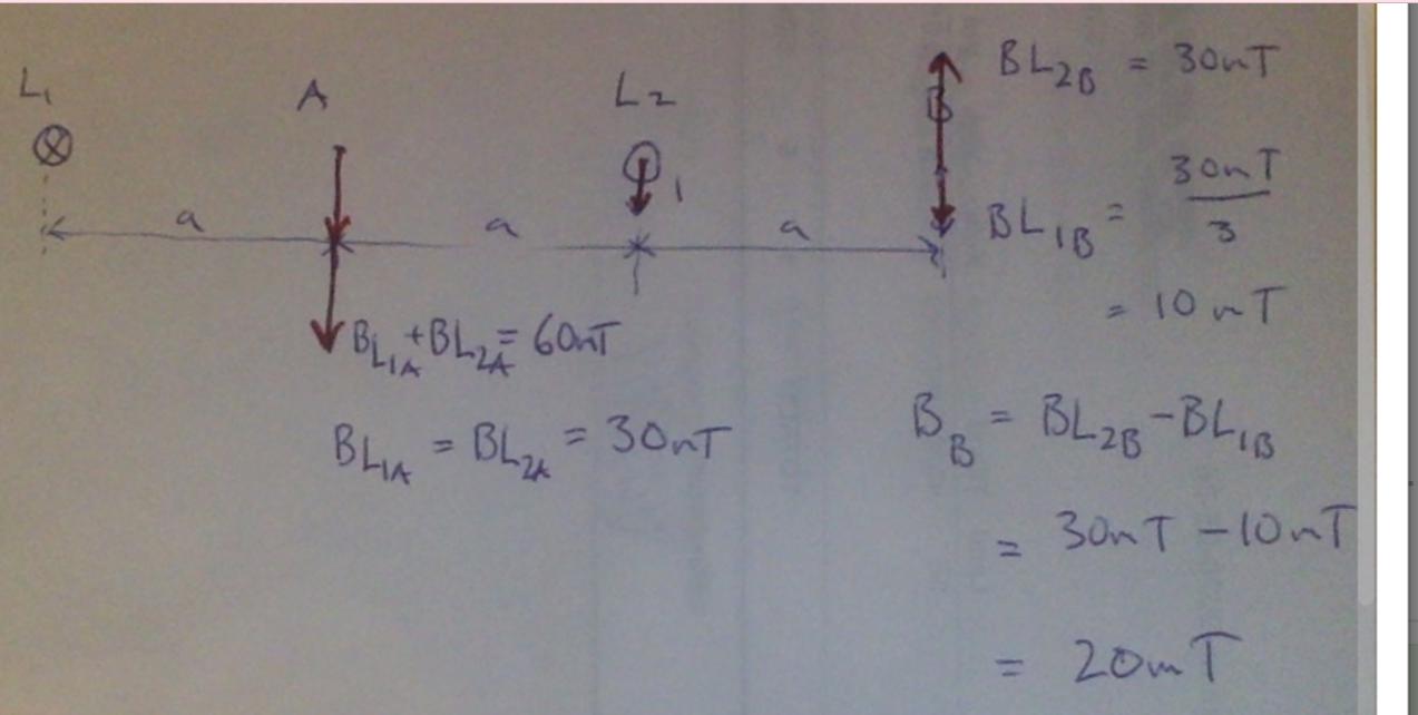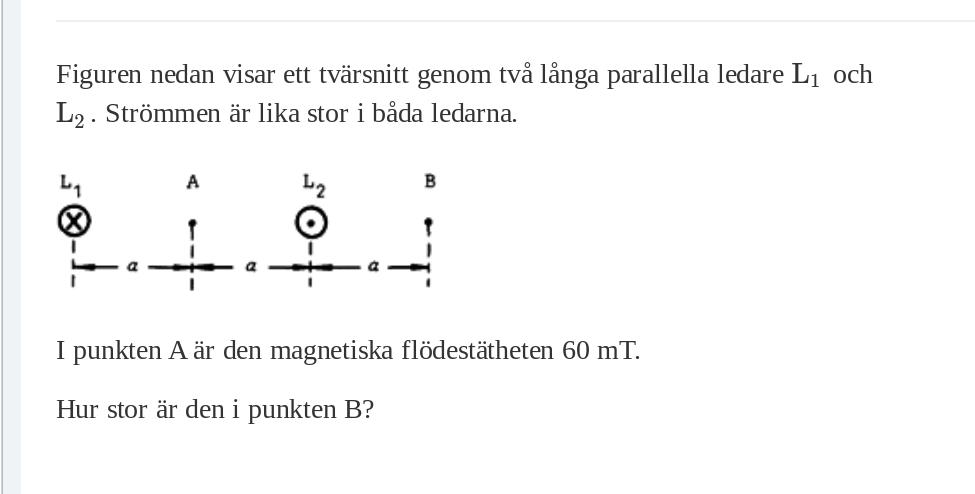 I punkten A samverkar två stycken magnetfält som båda två pekar åt samma håll. I punkten B är det bara det ena fältet. Därför är flödestätheten hälften så stor i B som i A.