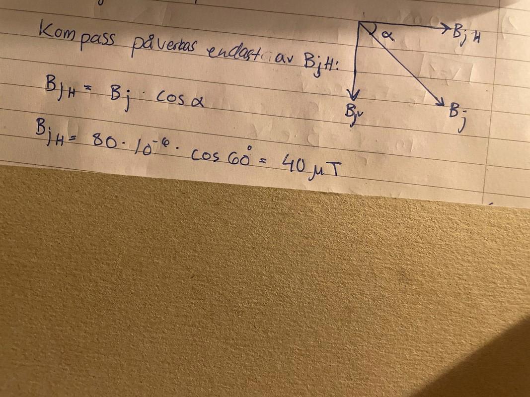 En orienterare upptäcker att 2,0 m rakt ovanför henne korsar två isolerade likströmsledningar varandra. I den ena ledningen går strömmen 400 A mot väster. I den andra går strömmen 50 A mot norr. Jordmagnetiska fältet har flödestätheten 80 uT och inklinationen är 60º. I vilken riktning pekar kompassnålen? (Hon befinner sig på norra halvklotet.)
