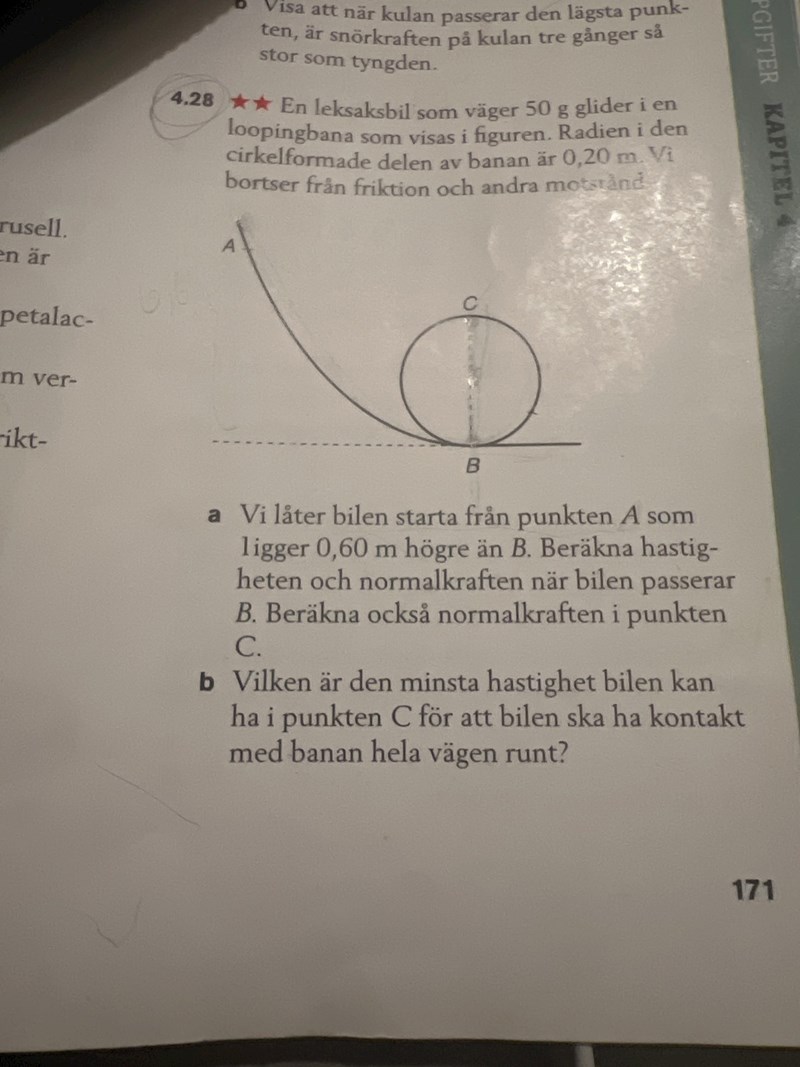 Normalkraften är kontaktkraften mellan banan och bilen. I gränsfallet, precis när bilen tappar kontakten med banan, är normalkraften noll. Det är då bilens hjul tappar kontakten med banan.