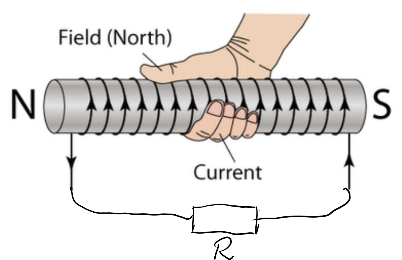 När du väl vet åt vilket håll det inducerade magnetfältet skulle vara riktat om spolens strömkrets sluts, så använder du till exempelvis högerhandsregeln enligt nedan