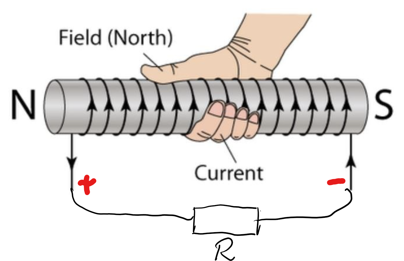 det förstår jag. Jag förstår att spolen inducerar en spännig och ett magnetfält riktat åt höger, men då borde väll strömmen vara pekad nedåt enligt högerhandregeln och då borde plus och minus byta plats eftrsom strömmen går från plus till minus och om den ska få nedåt kan plus inte vara där den är på bilden...?