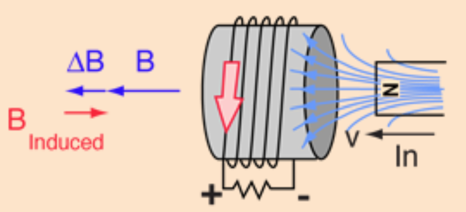 Det "röda" magnetfält i spolen som denna inducerade ström ger upphov till, försöker att motverka det "lila" magnetfält som var upphov till hela induktionsprocessen, och är därför motriktat (Lenz lag)
