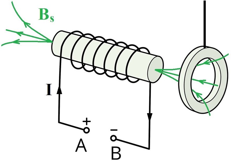 Nära ena änden av en elektromagnet hänger en kopparring. Ett batteri kopplas in så att A blir positiv.