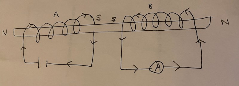 Om vi kopplar ett batteri till spole A, vilken riktning får strömmen genom amperemetern?