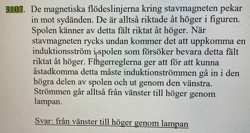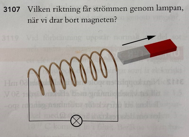 Jag tror att det är facit som har rätt svar. Flödeslinjerna pekar ju som sagt in mot sydänden på magneten så magnetfältet går från vänster till höger genom spolen. Enligt Lenz lag ska spolen motverka försvagningen av detta fält när magneten avlägsnas. Både spolregeln och skruvregeln säger då att strömmen måste gå från höger till vänster genom lampan.