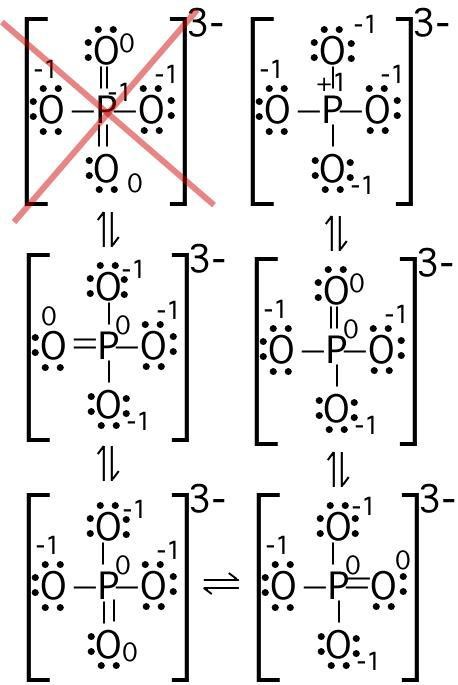 Om man ser till att fixa båda sakerna samtidigt, får man den struktur som är längst upp till höger. Den har nackdelen att den har en positivt laddad fosforatom bunden till 4 stycken negativa syreatomer. Alternativet är att man har en dubblebindning mellan fosforatomen och en av syreatomerna, vilket är de fyra andra resonansstrukturerna. Detta är möjligt eftersom det finns tillgång till d-orbitaler i fosforatomen. Den överkorsade strukturen är där negativa atomer är bundna till varandra, vilket är osannolikt. Nu har jag kallat det för laddade atomer, vilket inte är helt korrekt. Egentligen borde jag ha beskivit var man har en extra hög elektrondensitet istället, man jag är för lat för att formulera om mig.