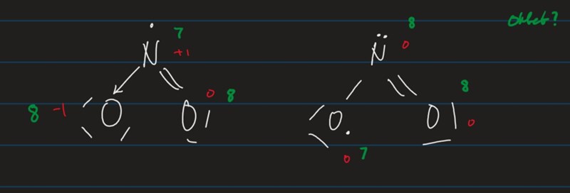Hej, varför är följande lewisstruktur till höger för NO2 inte rätt? Jag har googlat och vänster är rätt.