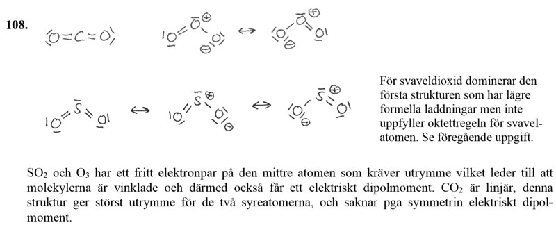 Ozon gjorde jag fel, jag gissade på att det skulle vara två dubbelbindningar, syret i mitten har ett fritt elektronpar, syrerna på sidorna har två fria elektronpar var (Såhär ::O=Ö=O::). På så sätt har ju alla syreatomer noll formell laddning, är det inte bra? Två av de uppfyller oktettregeln, inte den i mitten då. I svaret uppfyller alla tre syreatomer oktettregeln, men har inte noll formell laddning.