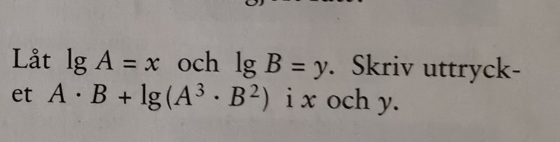 Kan du börja med att använda en logaritmlag på uttrycket lg(A3.B2) så att det blir mindre krångligt? Vänta med att göra om det till x och y.