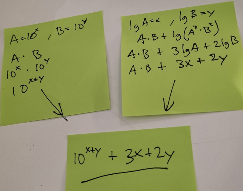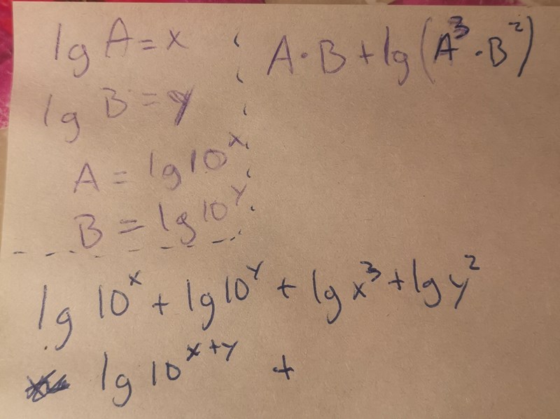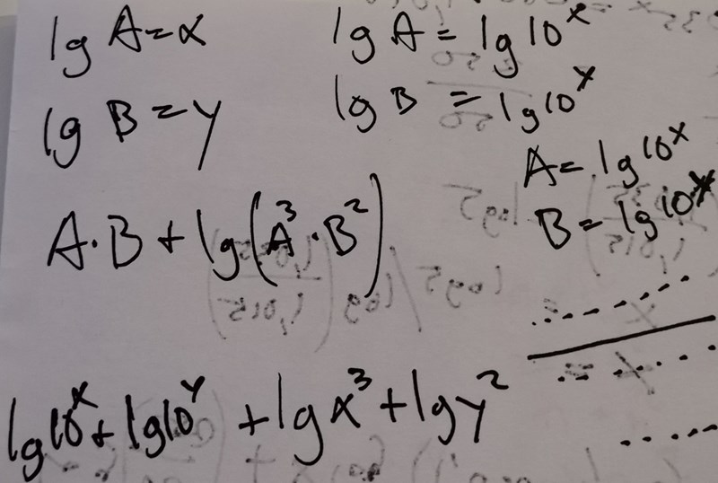Du har skrivit att lg A = x och att A = 10x samt att lg B = y och att B = 10y.