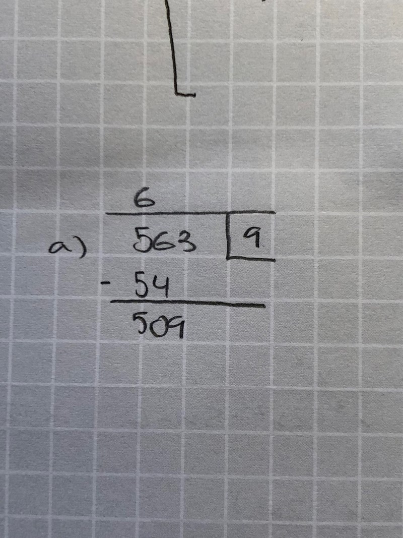 Nedan visas hur jag har gjort. Jag tänker först att 9 går 6 gånger i 56. 9•6= 54 och därför subtraherar jag 54 och får då kvar 509. Sedan ska man väl tänka hur många gånger 9 går i 509, men då blir det helt fel. Hur ska man tänka här?