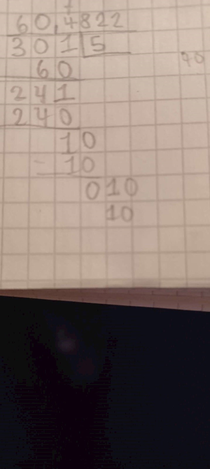 - Sen subtrahera jag 60 från 301. Kvar blev det 241. Sen går 5, 48 gånger i 241. Så då skrev jag 240 under. Samt 48 på kvotlinjen. Sen subtraherade jag 240 från 241. Kvar blev det 1.