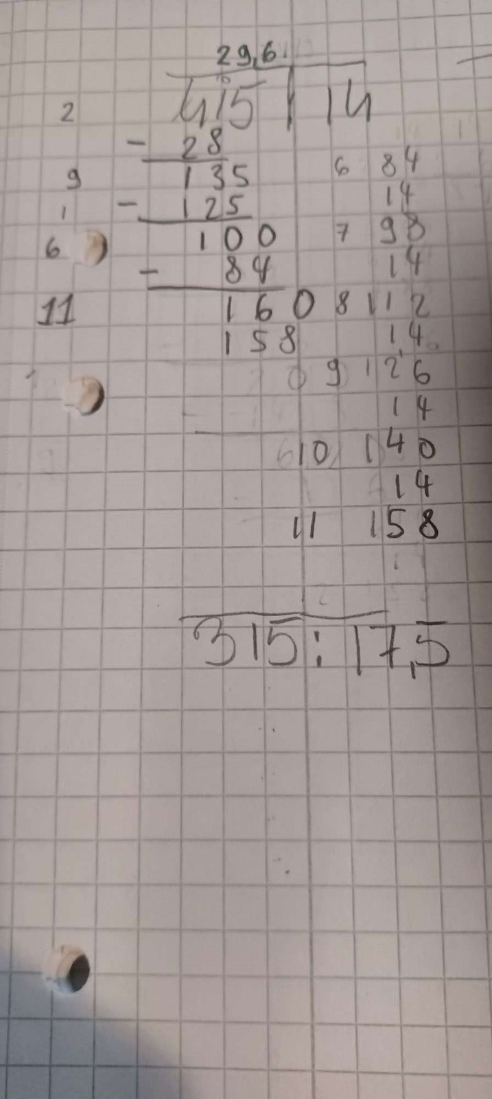 Försökte dela 2 tal (415 / 14)med liggande stolen och det blev konstigt för fick det till att 14 går 11 gånger i 160 fast när jag kollade med miniräknaren så blev det 29,64... och inte 29,611 som jag kom fram till.