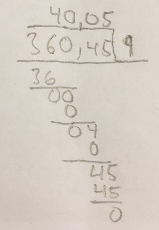 2) Stämmer det att man i uträkningen får fram nollor mitt i svaret på två olika sätt beroende på om man är i heltal eller decimal? Att det i heltal ( 1205) kommer sig av att man får in nämnaren 20 gånger i den konstruerade täljaren och då skriver ut hela den siffran i svaret och i decimaler (23,607) beror på att man behövde addera ännu en nolla i den konstruerade täljaren för att den första inte räckte till och då behöver lägga till en nolla i svaret för att det ska bli rätt.