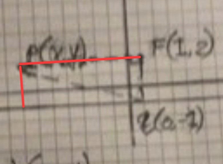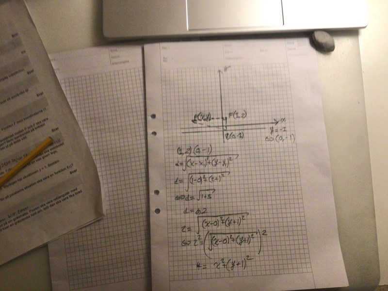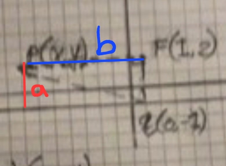 Tips: Om koordinaterna för punkt P är (x, y) så är längden av den röda sträckan lika med a = |y-(-1)|. För att bestämma längden av den blåa sträckan, dvs b, måste du använda avståndsformeln.