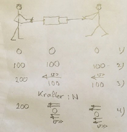 Om vi tänker oss att två personer står på varsin sida om dynamometern och drar i ett rep med lite olika krafter enligt figur nedan.