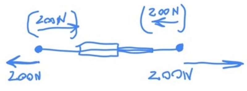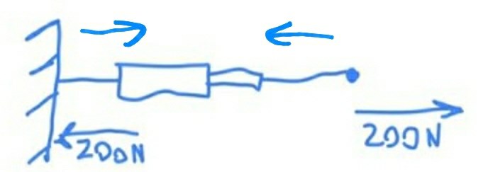 Går det med kraftpilar förklara varför dynamometern i bilden här skulle visa 200 N. Jag vet ju att den kommer visa 200 N, men kan inte förstå det helt. Jag vet andra förklaringar på problemet, såsom att man kan jämföra situationen med att fästa ena änden av repet i ett träd, men jag vill gärna kunna förstå det med kraftpilar.