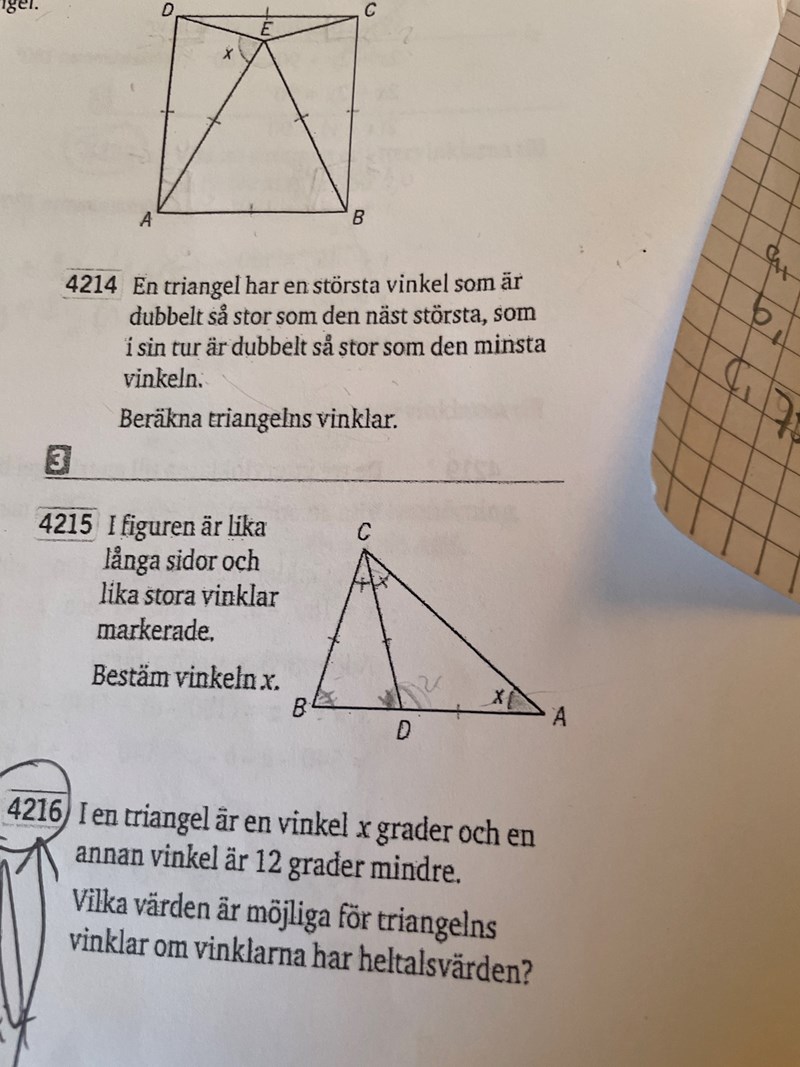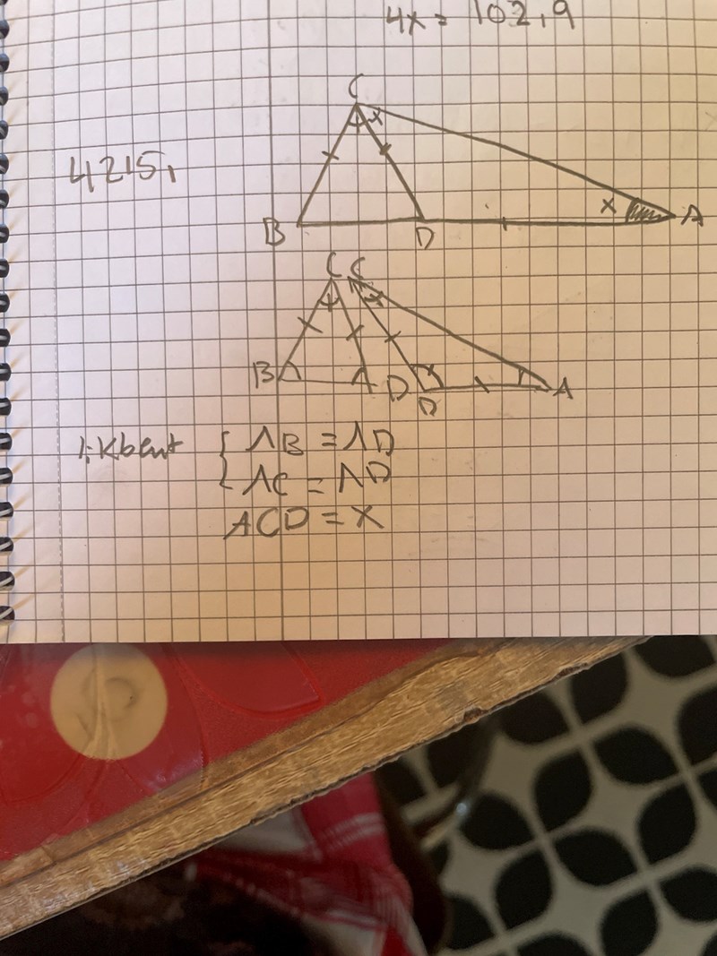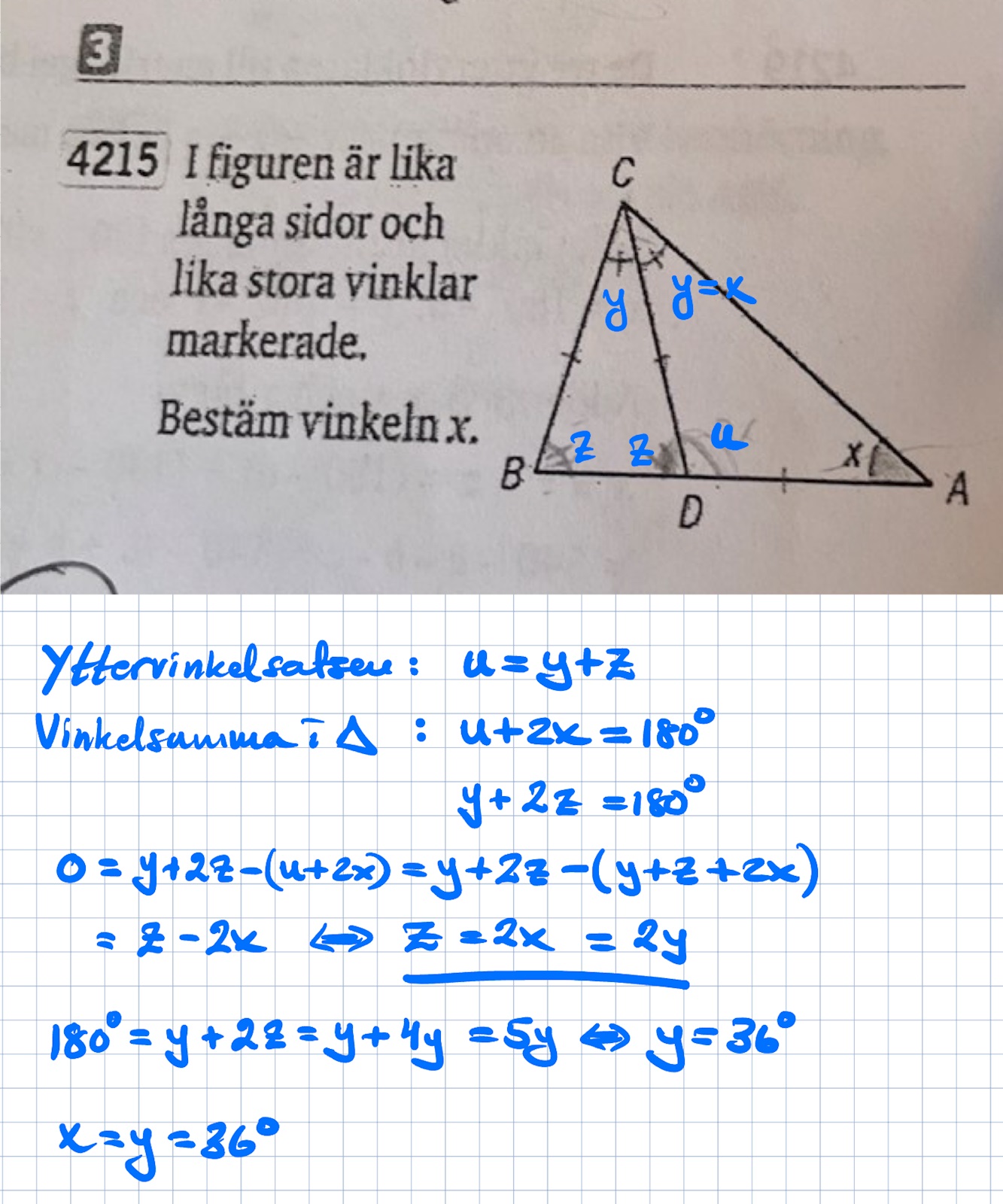 Jag fick halva svaret. Men jag vet inte hur ska jag försätta med att räkna ut x. I facit det står att x=36 grader
