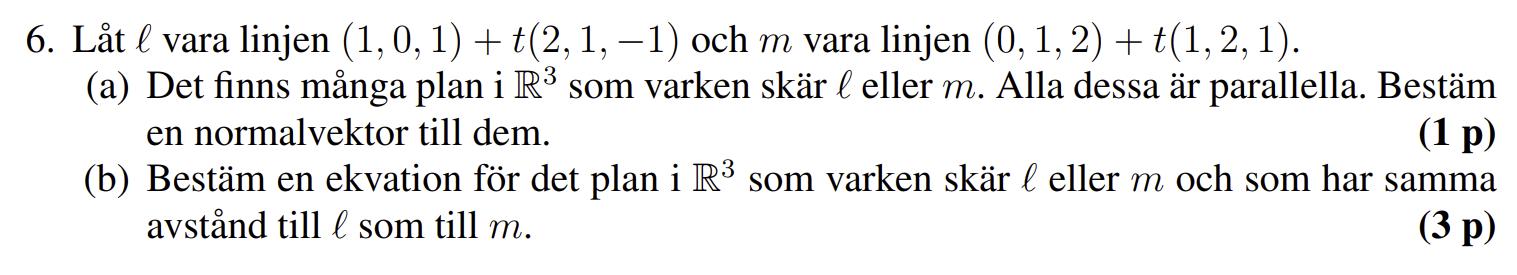 Jag har räknat a och fick att normalen blir (1,-1,1). Planets ekvation blir då x-y+z=d, där jag vill räkna ut d. För att lösa b tänkte jag att man kan ta där n är normalen och v1 är vektorn mellan en punkt på linjen l = (1,0,1) och en okänd punkt på planet = (x,y,z) (likandant för v2), för att sedan räkna ut (x,y,z). Detta blev dock väldigt komplicerat och facit skrev att man skulle skriva (x,y,z) som d helt enkelt. Utifrån detta förstår jag dock inte hur man ska tänka då jag ex får ett tal subtraherat med en vektor längre fram. Har någon ett förslag till hur man kan lösa detta enkelt? Facit förklarade ej tillräckligt.