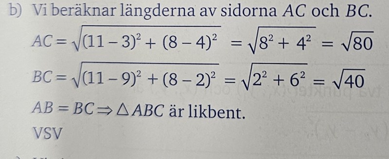 Är detta ett facit? Har inte AB beräknats? Det är ju AB som sägs vara lika lång som BC (medan AC har en annan längd).