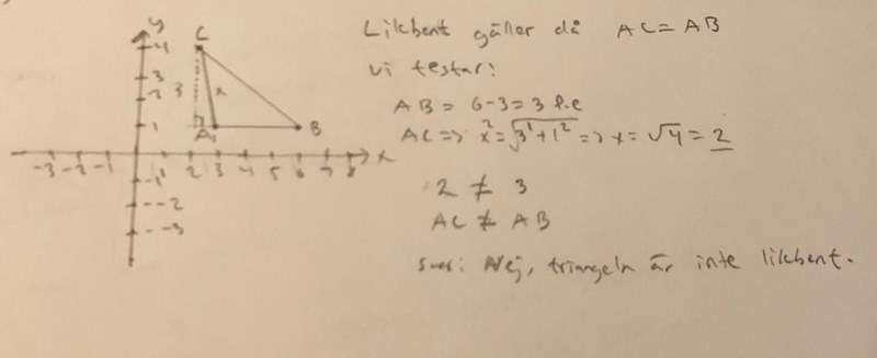Är detta rätt lösning av uppgiften: . En triangel har hörnen i punkterna (3,1), (6,1) och (2,4). Är triangeln likbent?