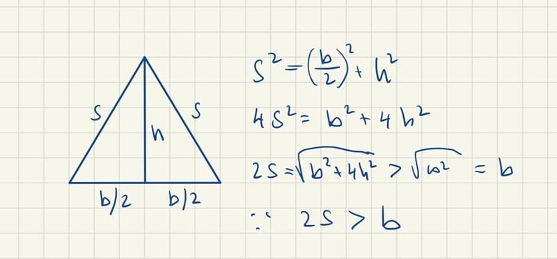 Detta är egentligen inga konstigheter. Tänk dig att du går från triangelns nedre vänstra hörn till triangelns nedre högra hörn längs basen b. Då har du gått sträckan b. Tänk dig sedan att du går mellan samma hörn men tar vägen via det övre hörnet så att du går länga sidorna s. Du har då gått 2s. Med denna väg är ju uppenbart längre än den första vägen - en omväg istället för raka vägen.