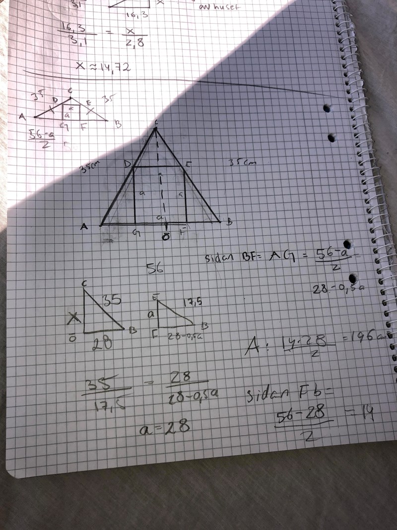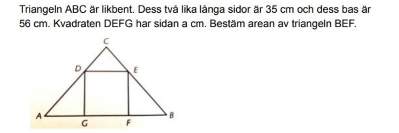 Hej! Är osäker vad gäller min uträkning. Den kvadraten som är inskriven i mitten delar den triangelns sidor i mitten? Jag kom fram till svaret att Arean är (14*28)/2=196cm2. Men jag har ingen facit.