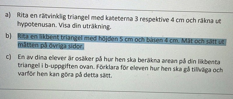 Fråga b) jag förstår inte frågan. Basen ska vara 4cm och höjden 5cm. Ska jag multiplicera 5*4 sen dela med två?
