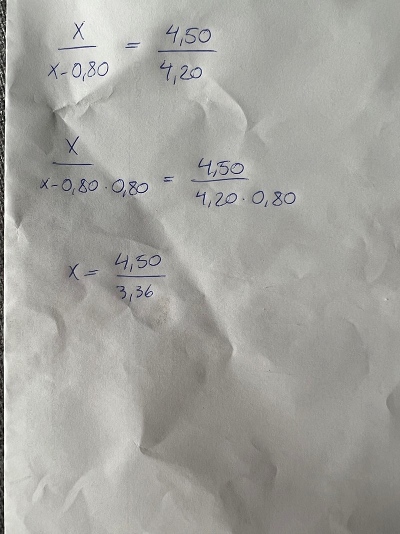 Jag ber om ursäkt men jag förstår inte hur jag ska räkna ut det där. vänsterledet blir väl X iom att (x-0,80) tar ut sig själv i nämnaren?