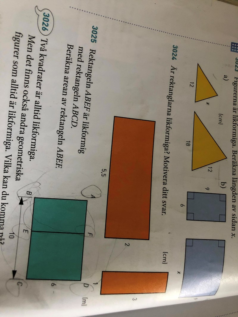 uppgift 3025. I facit står det x/6 = 6/10 för den okända sidan. Varför?? Betyder det att sen långsidan på rektangeln ABEF också är 6, som på den stora rektangeln?