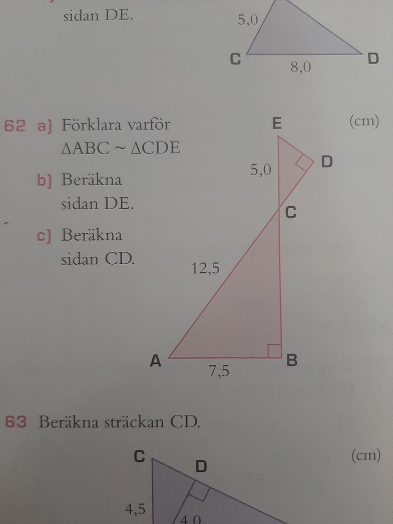 Jag behöver hjälp med c uppgiften på fråga 62. Jag vet att sidan DE är 3.