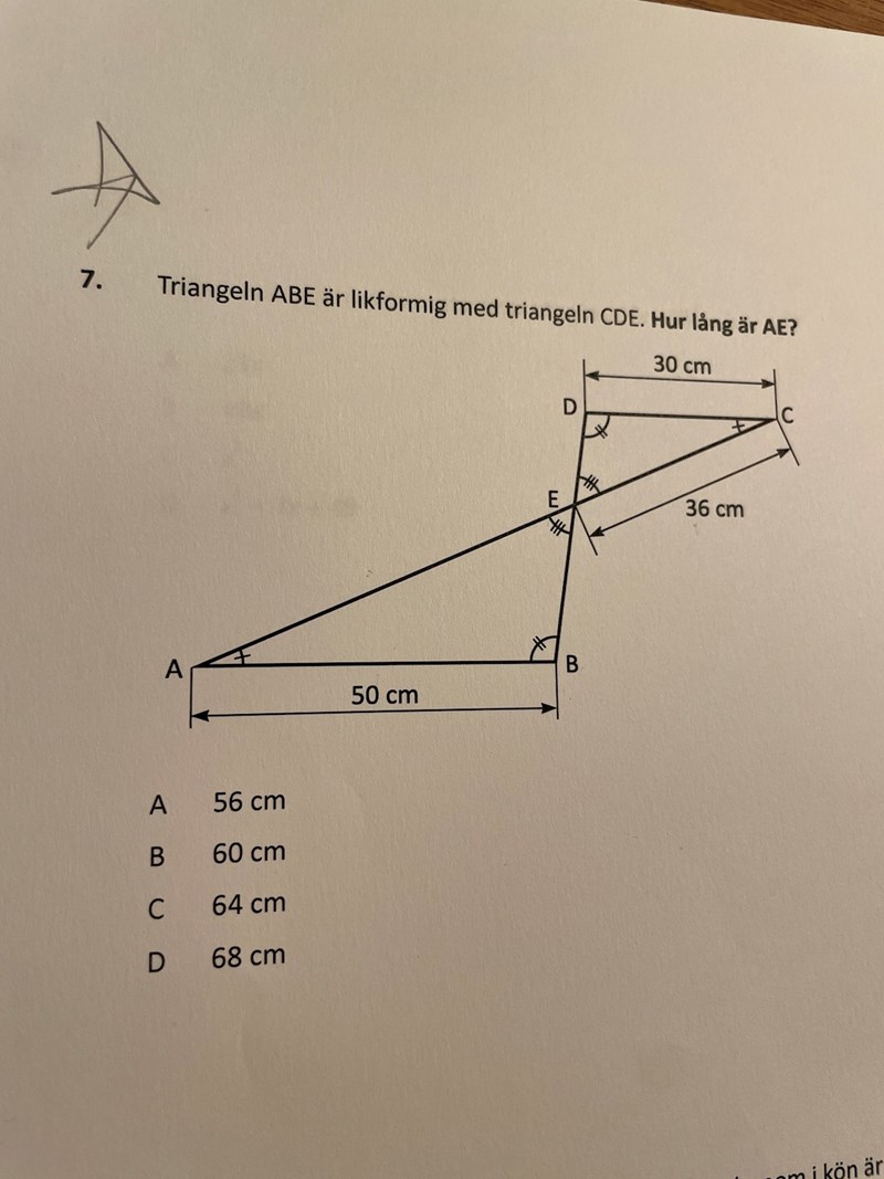 I likformiga figurer är förhållandet mellan sidorna alltid lika stort. Förhållandet mellan sidan AE och CE är därför likadant som förhållandet mellan de två vågräta sidorna (30 cm och 50 cm). Hur lång ska AE vara för att förhålla sig till längden 36 cm, på samma sätt som 50 förhåller sig till 30?