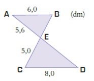 Eftersom AB är parallell med CD så kan vi ta 6/8=0,75. Eftersom trianglarna är likformiga betyder det att sidorna växer med 0,75 i den större triangeln. När vi ska räkna ut BE kan vi ta CE som är katet 1 på både trianglar, alltså ska vi ta 5*0,75=3,75