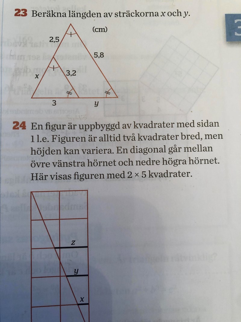 Hej! Jag skulle behöva hjälp med uppgift 23 i min mattebok. Jag har lyckats räkna ut hur många gånger större den stora triangeln är jämfört med den lilla och på så sätt kunde jag räkna ut vad y är (se bild nedan). Dock så jag jag försökt länge med x med olika metoder men kan inte få rätt svar. Skulle vara supersnällt om någon kunde hjälpa mig att visa hur man räknar ut vad x är!!