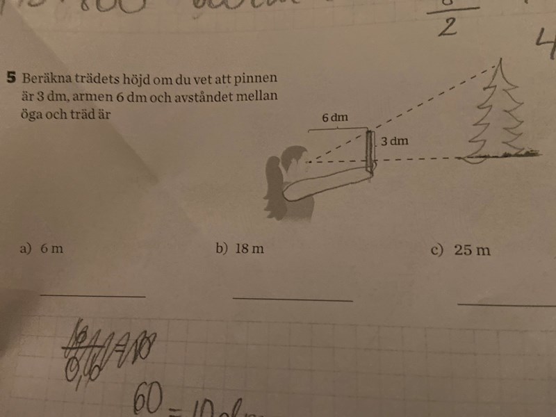 Förstår inte hur jag ska tänka. För att räkna ut avståndet mellan öga och träd- ska jag ta 6m och dividera med 0,6 m (armen som är 6dm) för att få fram förhållandet? Då blir det ju 10. Och sen, ska jag ta 3 dm dvs 0,3m * 10=3m? Känns ju inte helt rimligt. Tack på förhand!