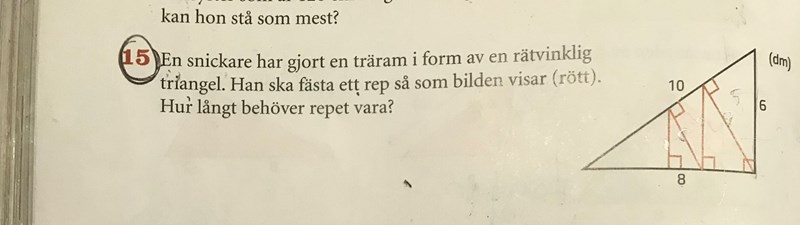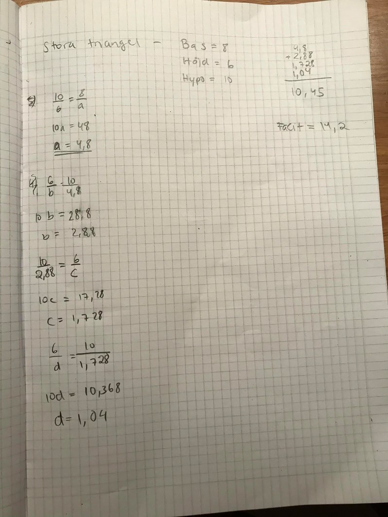 Om vi även räknar med den stora triangelns korta katet 6 cm som är hypotenusa i den första mindre triangeln.