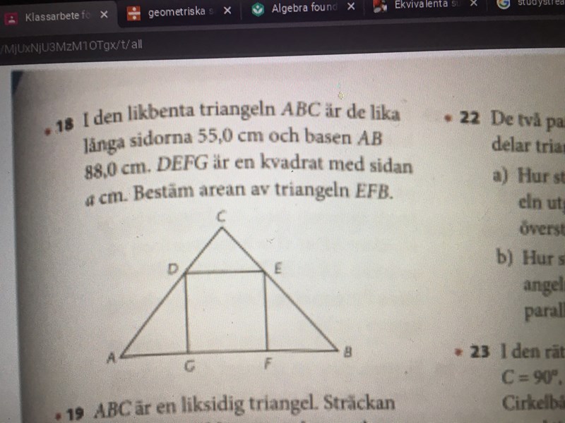 Du har att hela basen är 88 cm. G till F är a eftersom det är en likbent triangel där AC och CB är lika långa så är AG lika lång som FB. Du kan därför räkna ut vad FB är. Då har du basen *höjden i EFB och kan räkna ut ytan.